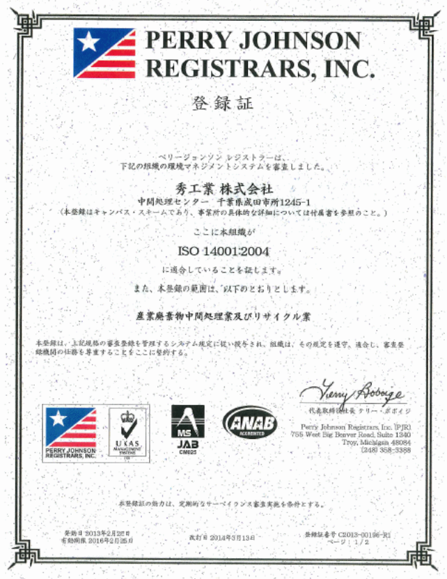 当社は「産業廃棄物中間処理業及びリサイクル業」において、環境マネジメントシステム(ISO14001)の認証を取得しました。