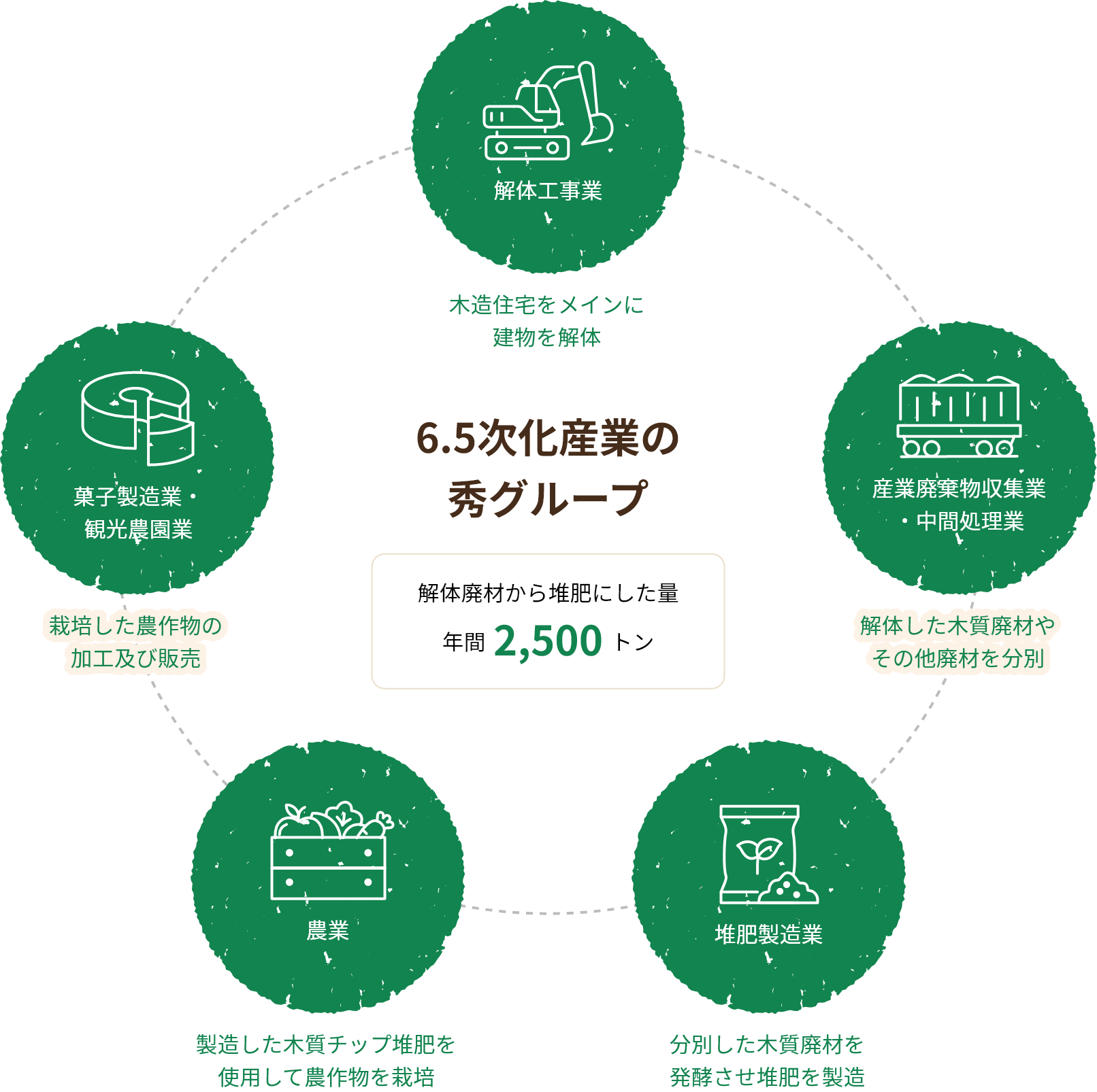 秀グループでは、解体工事業から始まり観光農園業までリサイクルを通じて一貫した事業を運営しております。